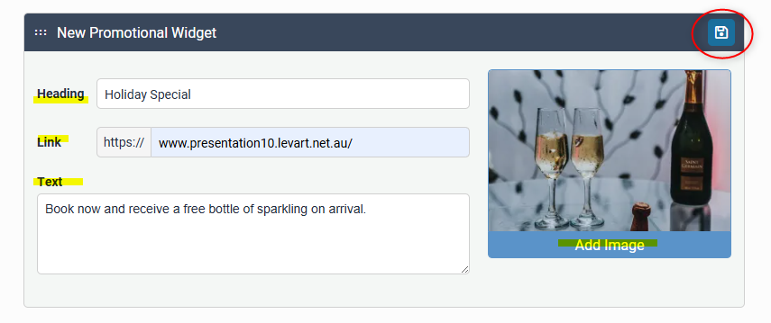 Ensure you click the Save icon to save the Promotional Widget. The Promotional Widget will display on your website and will link visitors to the URL entered when clicked.