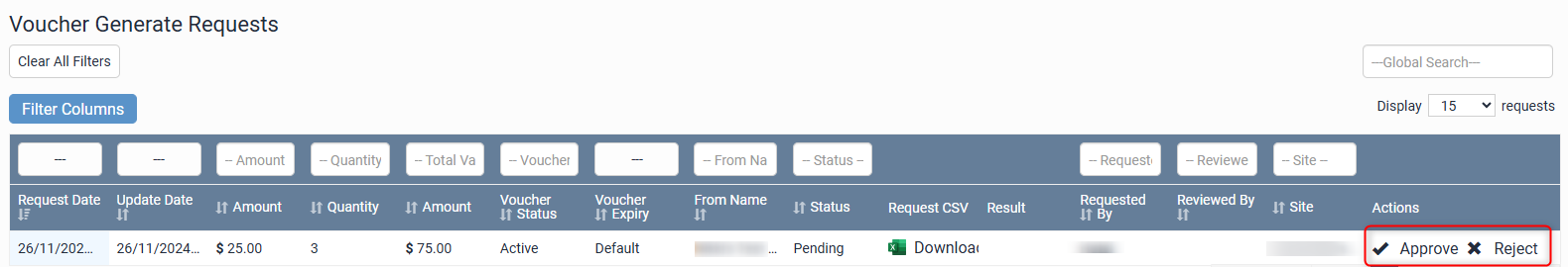 Once the request has been created, it will show in the table below. The request needs to be approved by the specified user/s for the vouchers to finish generating. Please tell Levart Support which users have authority to approve bulk voucher creations.