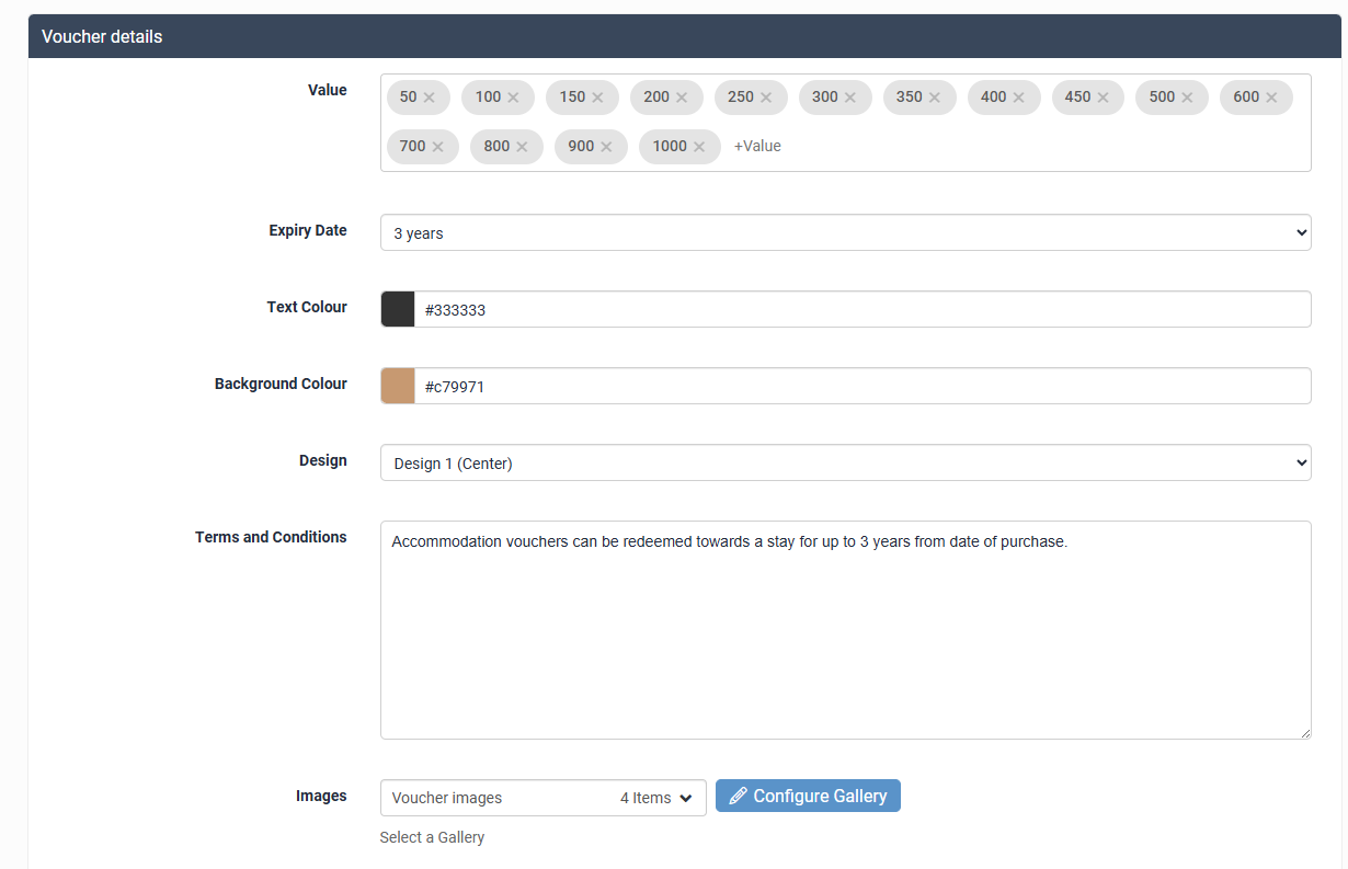 - Assign a gallery - these are the images that can be applied to the voucher (see below for information on creating a gallery)