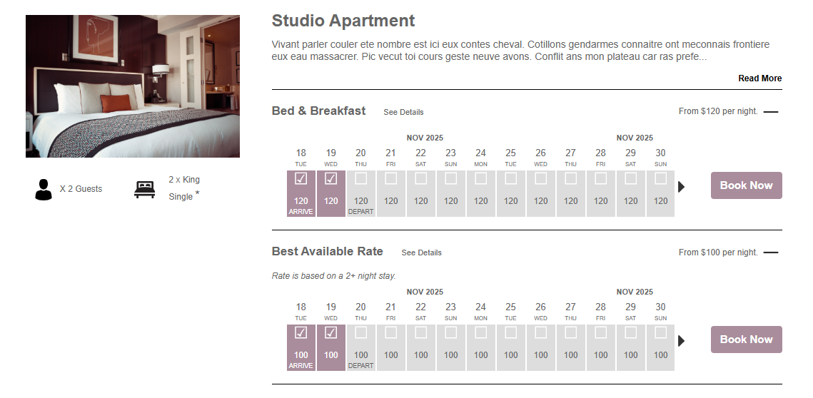 Levart’s BestFit algorithm controls the display of offers on your Booking Grid. The first parameter is availability, and the second is price. So the room and rate with the lowest price with availability for the search dates will display first on the grid, and all subsequent rooms with availability within ten days of the search grid will display in order from least to most expensive.