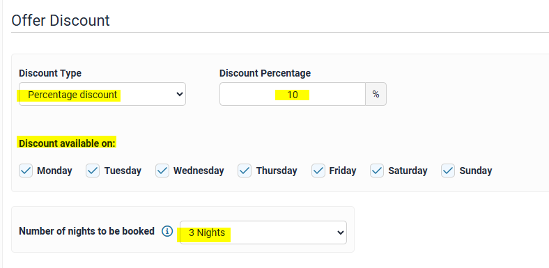 Enter the percentage discount you would like applied when the specified number of nights has been selected for a booking in the Discount (% discount) textbox. This percentage discount will apply to all nights of a booking