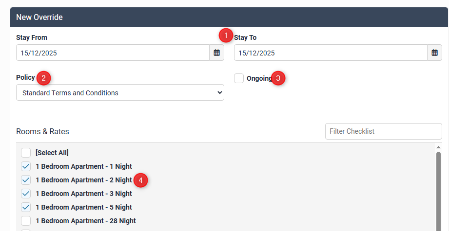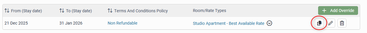 Once you have created an override, you can clone it if you would like to copy the settings (e.g. policy and linked rates) but apply it for different dates. On the Overrides page, click the Clone button