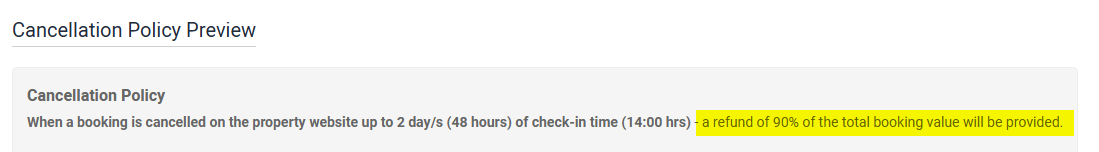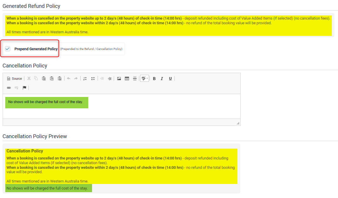 If you have entered the refund configurations, an automatic cancellation policy will be generated based on the refund settings you entered. Tick the include box if you would like this to display in your Cancellation Policy text (it will prepend your manual text).