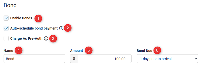 - Tick Auto-schedule bond payment (if this is not selected, the bond amount will display to the guest when booking, but it will NOT be processed or scheduled automatically)