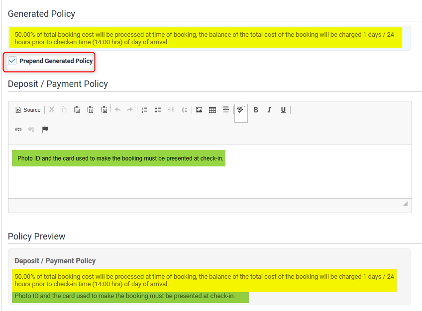 An automatic deposit policy will be generated based on the deposit setting you entered. Tick the include box if you would like this to display in your Deposit/Payment Policy text (it will prepend your manual text).