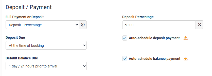 - Deposit - Set Amount: Set dollar amount or booking total taken as deposit, whichever is lower.