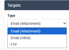 Select the format you wish to receive your schedule in from the Targets dropdown menu. An Email Attachment will send a CSV file as an attachment to your email. This is the recommended schedule format, as it is easier to sort and view large amounts of data. An Inline Email will send the booking data in the content of an email. An FTP target will upload a CSV to your server.