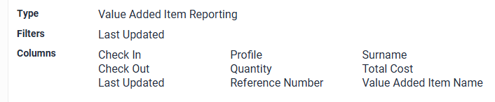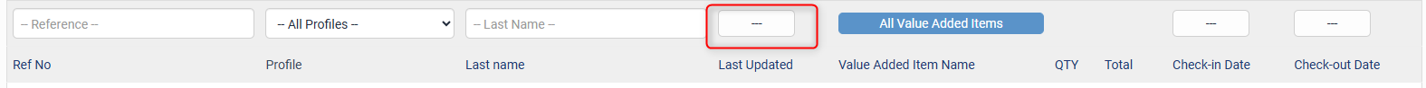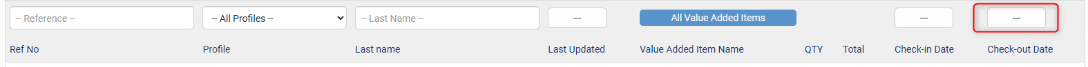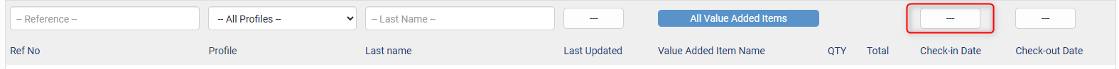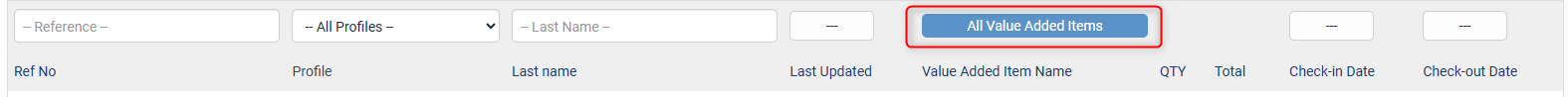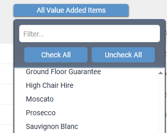 This field allows you to search for bookings based on the Value Added Item the booking was made on. You have the ability to type into the Filter textbox to find a specific Value Added Item, Check and Uncheck all items, or click and drag down to select multiple Value Added Items.