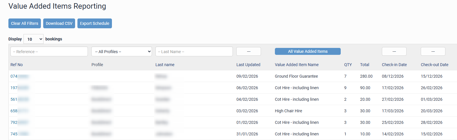This is a list of bookings with Value Added Items as they have been made. Some bookings may span multiple rows if multiple Value Added Items have been purchased. They are listed in chronological order, with the most recent booking at the top.