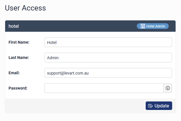 The User Access page is for Levart staff to create and edit accounts that have access to Levart Admin sites. Levart strongly recommends that each staff member be given their own personalised login for the security of the system.