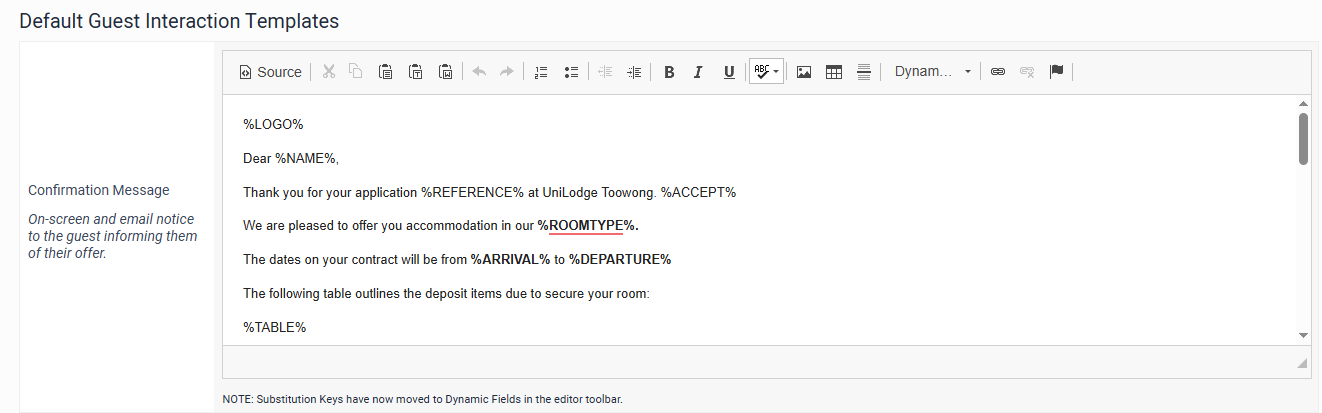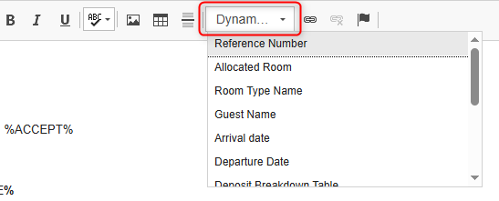 For dynamic fields (e.g. room type, guest name etc.) select the dynamic fields dropdown to insert the tag into your desired placement.