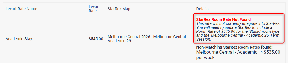 If a rate is mapped to StarRez but it can't find a matching price within the StarRez term session, it will provide a warning such as the below: