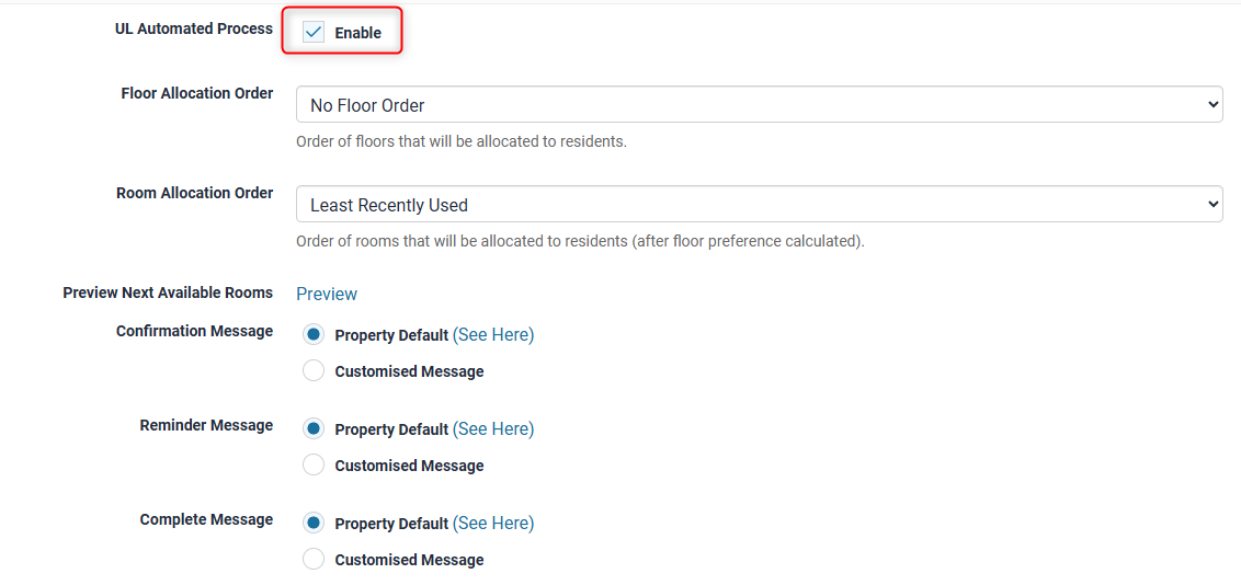On the room type properties page, tick the enable box for UL Automated Process and select the desired settings > Submit
