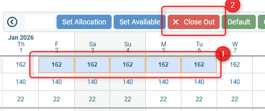 To close out dates and make the room unbookable, select the required dates and then click the close out button: