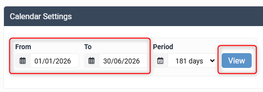 - Using the Calendar Settings, select the entire range of dates that you need to update and click view