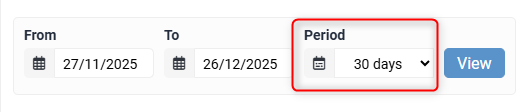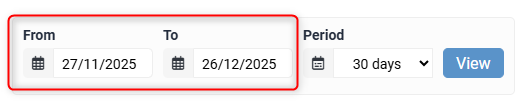 Alternatively, you can use the Period function to select a period to display. This period begins at the date set in the From date box, and once a new period range is selected, the To date box will automatically update to the relevant date