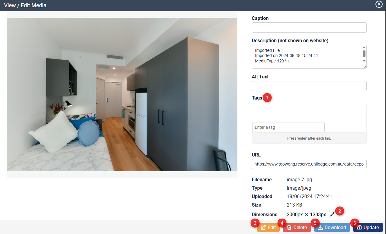 - Tags - for internal use to help with filtering images (e.g. room type). Add a tag and click enter for it to apply. You can add multiple tags per image.