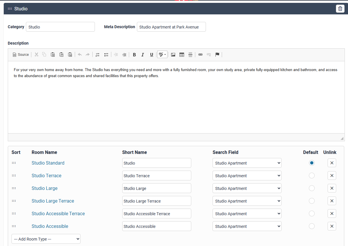 Click the default Radio button on the right had side to nominate the default room type. This room type will display at the top of the category panel on the website view.