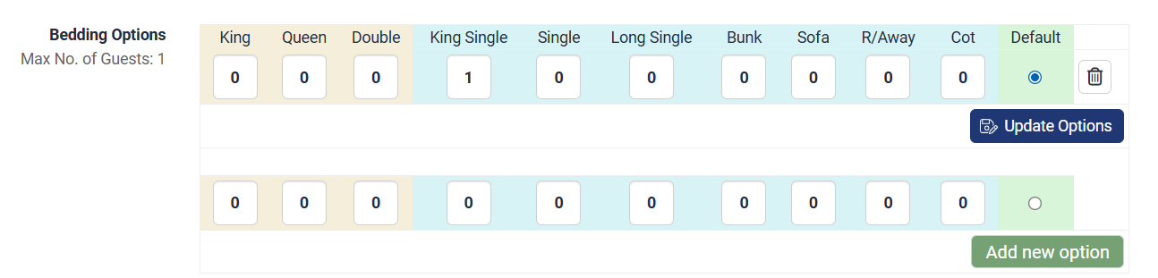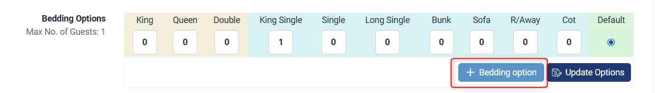 Bedding Allocation - To set up the bedding configuration for each room type, type in the bedding as per below and click “Add bedding option” to save.