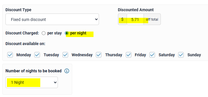 Discount is the dollar amount per night - i.e. ensure the weekly discount has been divided by 7 to calculate the nightly amount
