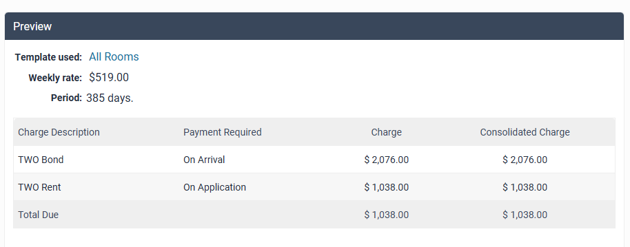 Any charges that should be taken to confirm the application must be added to the Template Items. For example 2 weeks rent deposit, bond, departure cleaning fee etc. The charge items pull out of StarRez.