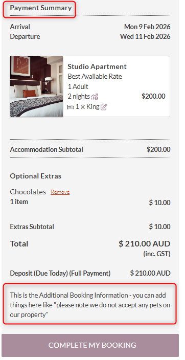 On this page the Payment Summary is displayed again at the top along with the Bedding Options and Additional Booking Information