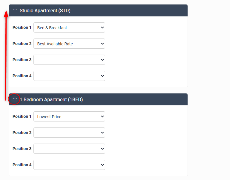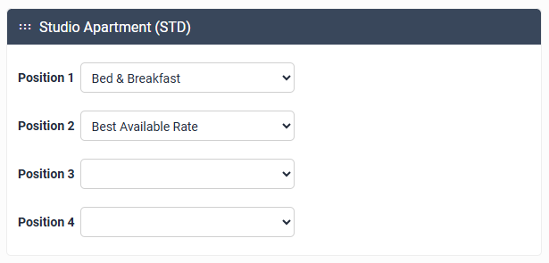 To override this (e.g. display a rate with a higher value first), use the drop down menu on the Position lines to select the rates you would like displayed. You can select up to four per room type, and these will display by default when searches are made without the guest clicking Show all available rates on your Booking Grid
