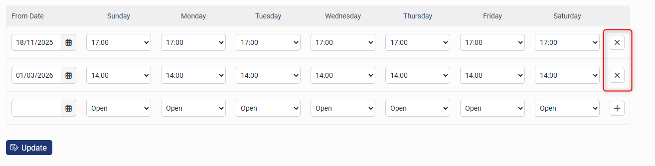All days are Open by default. Click on a day to set the time you wish the Automated Closeout to apply from. You can set a different time for each day, or leave the days as Open if you do not wish to apply a closeout on that day.