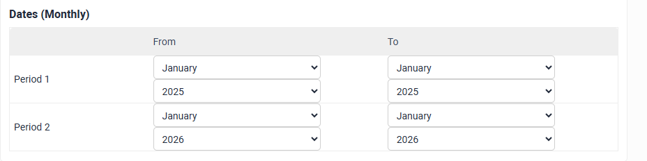Monthly Reports | Enter an extended date range i.e. Period 1 1 July 2013 to 30 June 2014 Period 2 1 July 2014 to 30 June 2015 The report will be generated by month. |