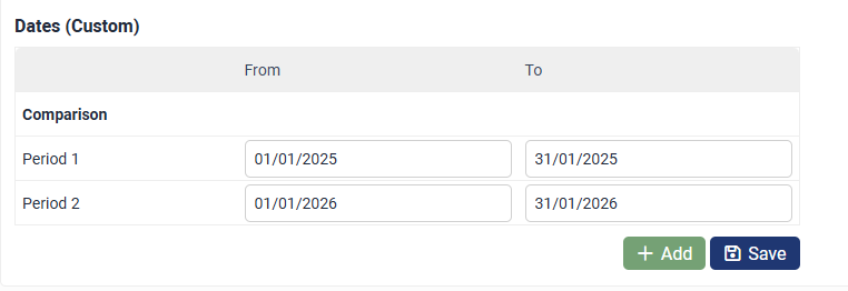 Custom reports | Create reports with any date range for Period 1 and period 2. This would be daily, weekly of set number of days for each period. Custom reports periods once created can be saved for later report generation. |