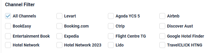 The channel filter function allows you to select which particular third party sites you would like to compare data with. By selecting All Channels this will compare data with all third party sites that you have active within Levart. Otherwise selecting individual Third party Sites for example Levart, Expedia and Booking.com you will then be shown the statistics to compare against each other.