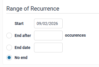You can set the schedule to end after a specific number of occurrences, end after a specific date, or no end.