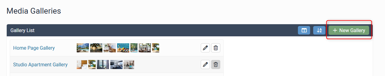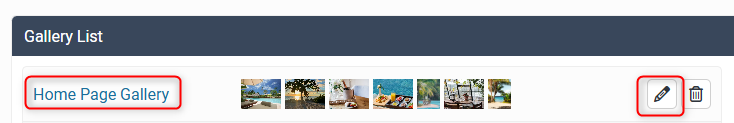 To edit an existing gallery, return to the Media > Gallery page and click on the gallery name or edit icon: