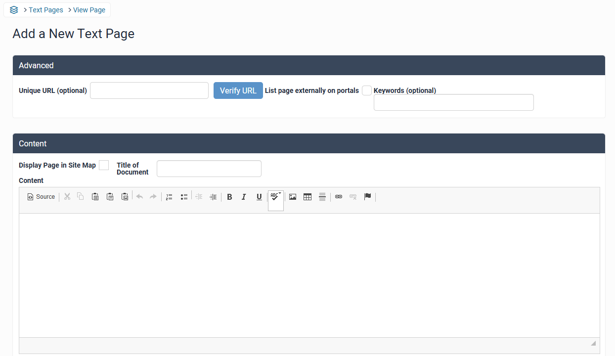 Enter the relevant text to the page you wish to create in the ‘Content’ section. You can also add images, videos, links etc.